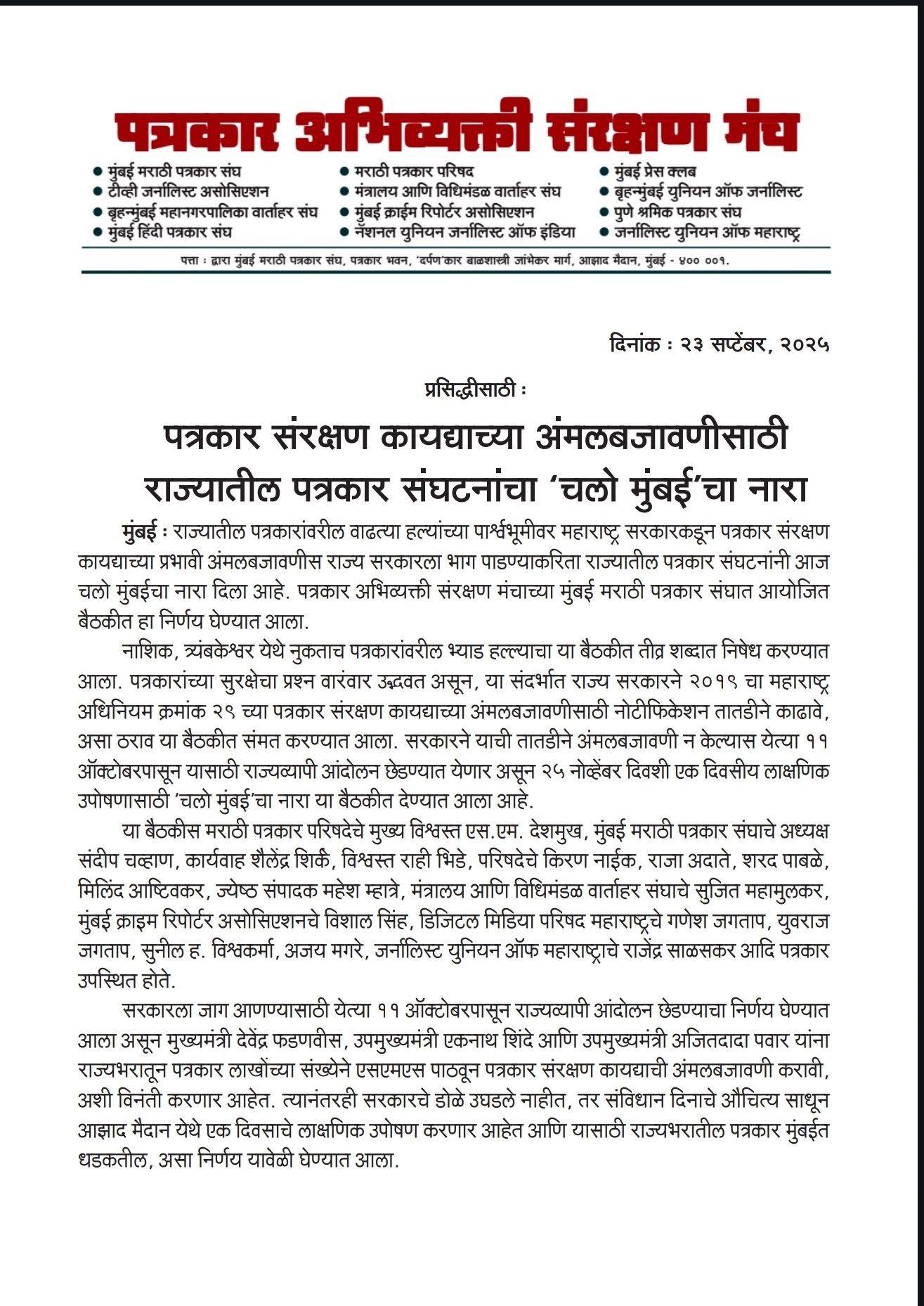 सरकारने तातडीने कार्यवाही केली नाही, तर ११ ऑक्टोबरपासून राज्यव्यापी आंदोलन सुरू करण्याचा इशारा देण्यात आला. तसेच, २५ नोव्हेंबर संविधान दिनी आझाद मैदान, मुंबई येथे एक दिवसीय लाक्षणिक उपोषणासाठी ‘चलो मुंबई’चा नारा देण्यात आला आहे. पत्रकार संरक्षण कायद्याची अंमलबजावणी करण्यासाठी मुख्यमंत्री देवेंद्र फडणवीस, उपमुख्यमंत्री एकनाथ शिंदे आणि उपमुख्यमंत्री अजित पवार यांना राज्यभरातील पत्रकार मोठ्या प्रमाणात एसएमएस मोहीम राबवून विनंती करणार असल्याचेही बैठकीत निश्चित झाले.